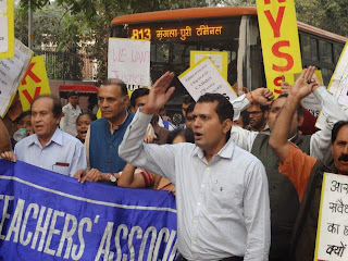 Sitaram Yechury (Politburo leader of CPIM) had a meeting with the President of India and Visitor to DU, Sh. Pranab Mukherjee, in order to apprise him of the prevailing situation in DU and the DUTA’s White Paper. He presented a copy of the White Paper on behalf of DUTA and conveyed the DUTA’s demand for a Visitorial Inquiry against the VC. Veteran leader of the JP Movement and President of the Lok Chetna Manch, Sh. Mithilesh Kumar Singh, came from Patna and joined the DUTA in this protest. Mithilesh Kumar Singh also accused the DU VC of manipulating the police and civic administration to shield corrupt principals like S. P. Gupta (Kirori Mal College) who have served as his loyalists.