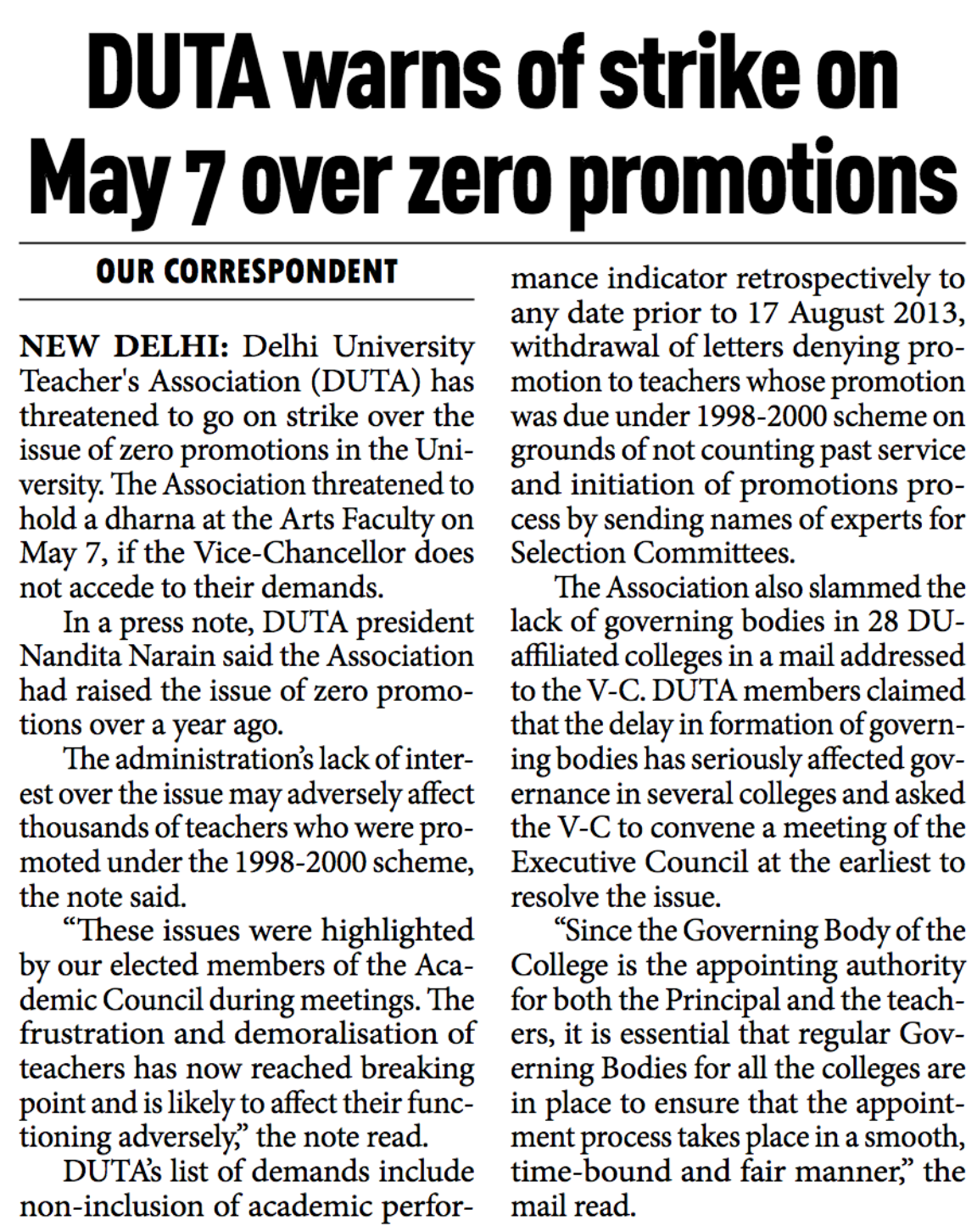 DUTA warns of strike on May 7 over zero promotions | Millennium Post