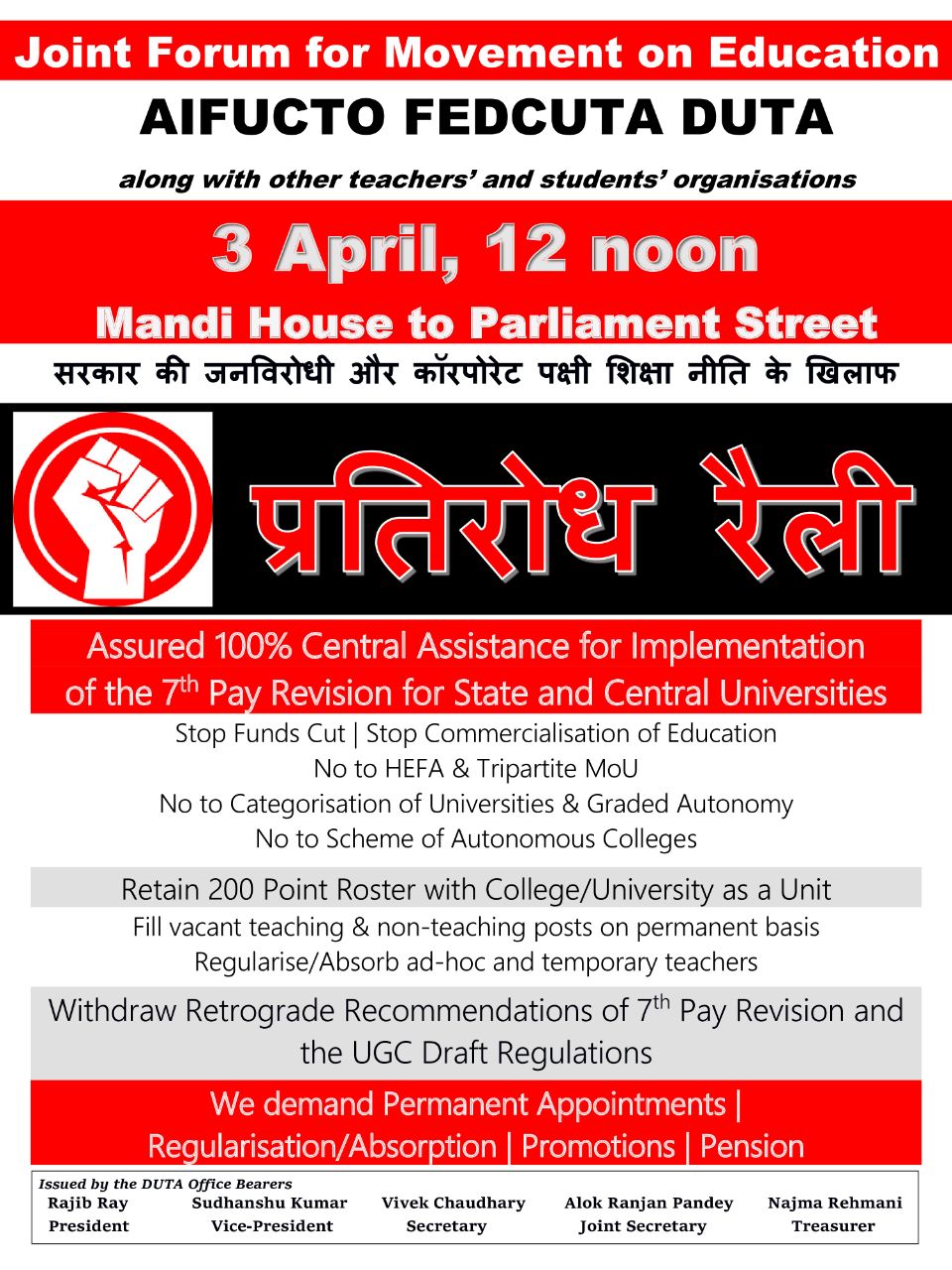 Taking the movement forward AIFUCTO, FEDCUTA and DUTA along with other teachers’ and students’ organisations under the banner of Joint Forum for Movement on Education (JFME) has called for a *Pratirodh Rally from Mandi House to Parliament Street on Tuesday, 3 April 2018, starting at 12noon. School and college/University teachers and students from across the country will march together in defence of public education. We appeal to teachers and students to join the Rally in large numbers.