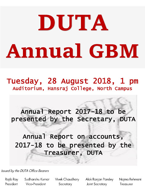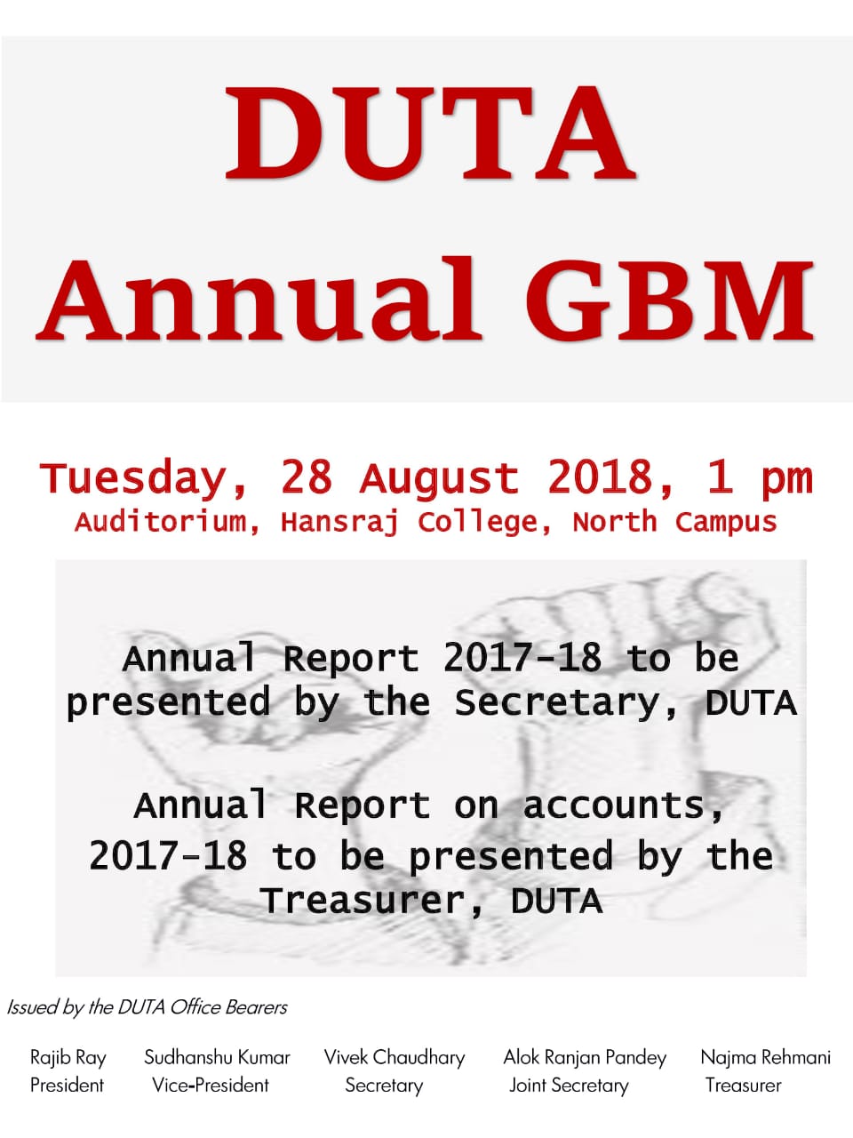 Annual Report 2017-18 to be presented by the Secretary, DUTA