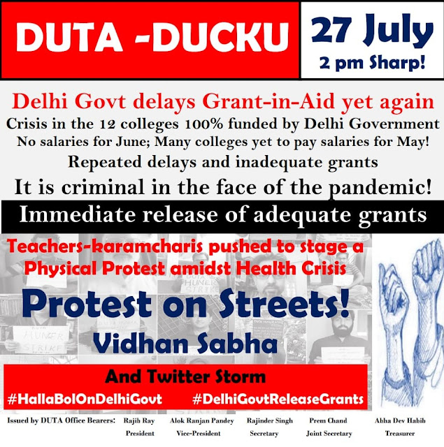 In consultation with the Staff Associations of the 12 colleges, DUTA-DUCKU will hold a physical protest at 2 pm sharp, Monday, 27.7.2020 at Vidhan Sabha to highlight the crisis. We will also share protest photos on FB and Twitter. Those colleagues who may not be able to join because of health issues etc, are requested to take to Twitter in support and post their protest photos.