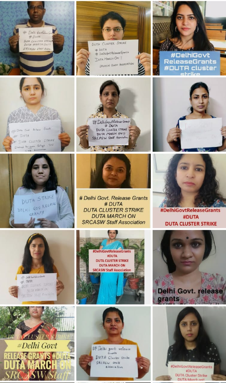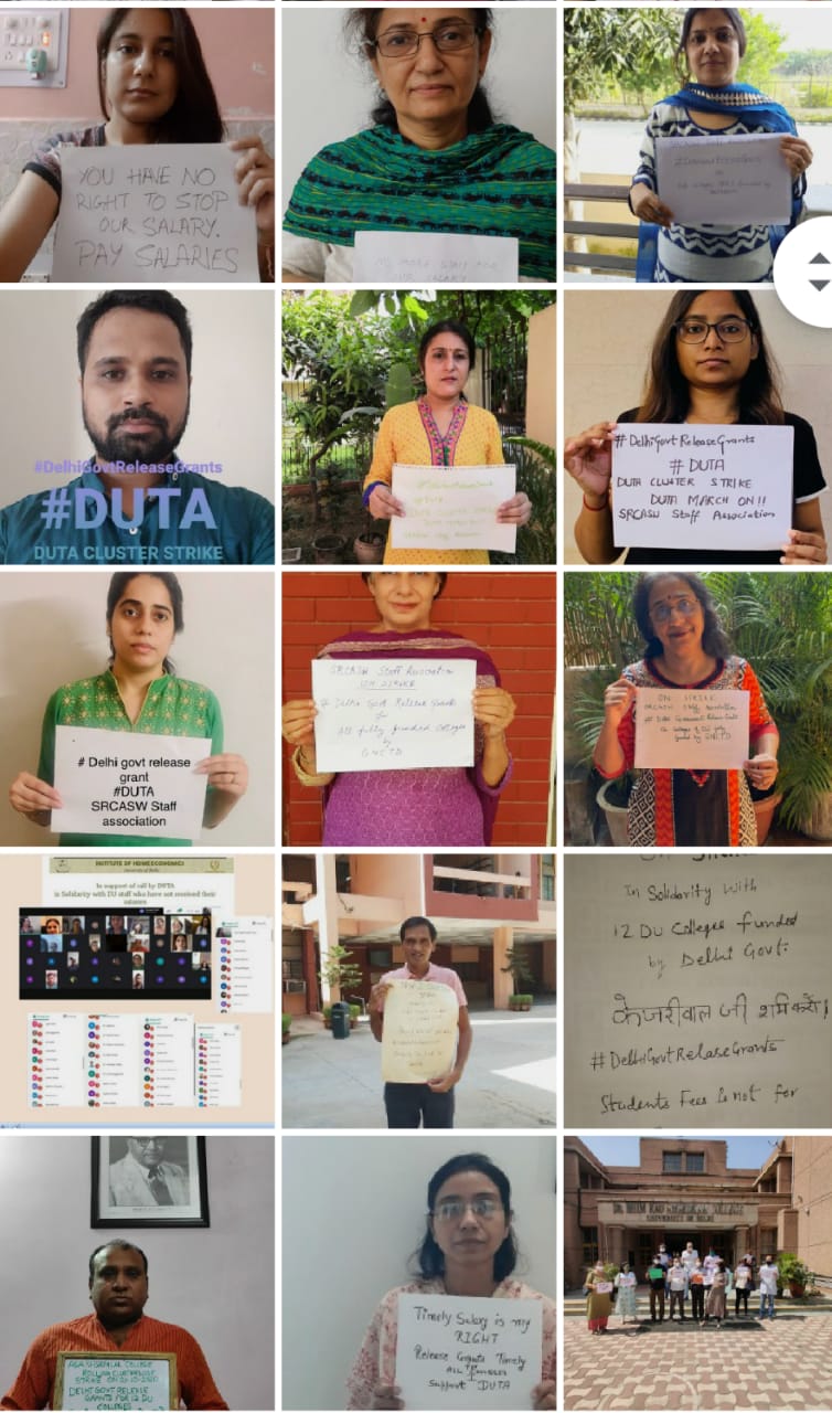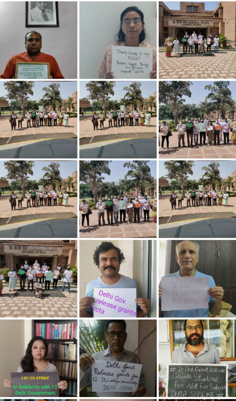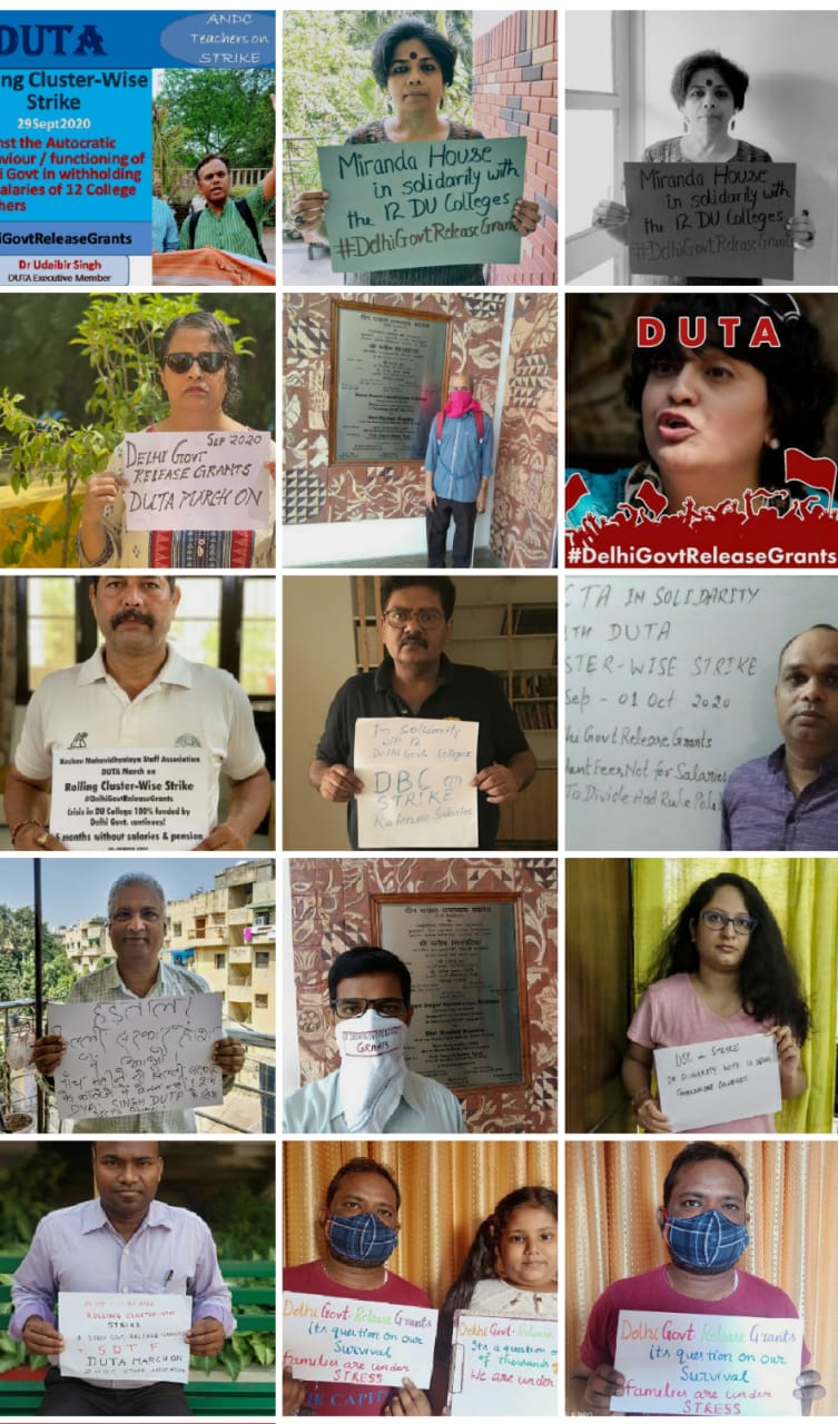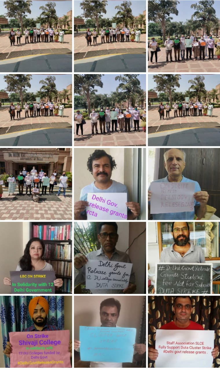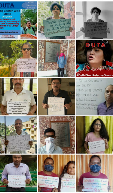 The ‘Rolling Cluster-wise Strike’ organised by DUTA ended today after 4 days of successful action programme across the University. On the fourth day of the programme, teachers of BRAC, MAC, IGIPESS, IP, LBC, Rajdhani, SRCAS, Shyamlal College (M & E), Satyawati (M& E), SGTB Khalsa, Shivaji College, SRCCC, SSC and VMC remained on strike and participated in online protest. Hundreds of teachers across colleges shared their protest photos on social media in solidarity with the 12 DU Colleges. During the 4-day protest, which started on 28 September 2020, Staff Associations of many of the 12 DU Colleges held physical protests in their Colleges. On the other hand many Staff Associations including JMC, IHE, LIC, SRCC and JDM held Zoom meetings to pass resolutions against the anti-employee action of the Delhi Government.