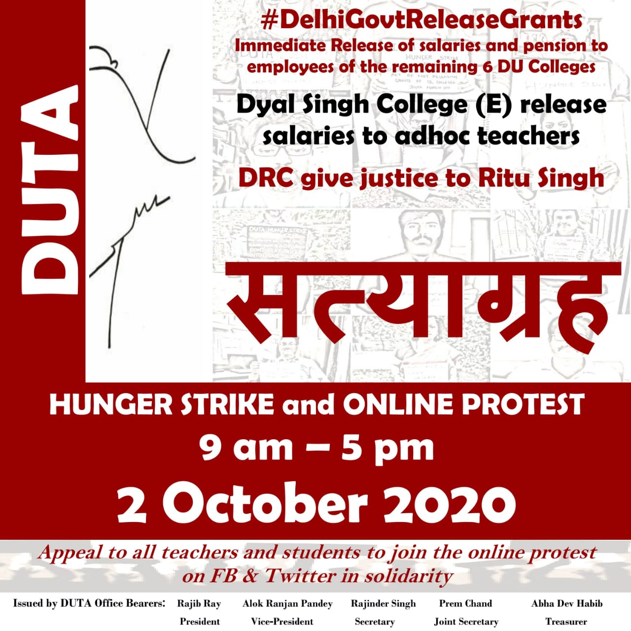 To highlight the issues related to salaries of teachers, DUTA has given a call of mass hunger strike tomorrow on 2 October 2020.