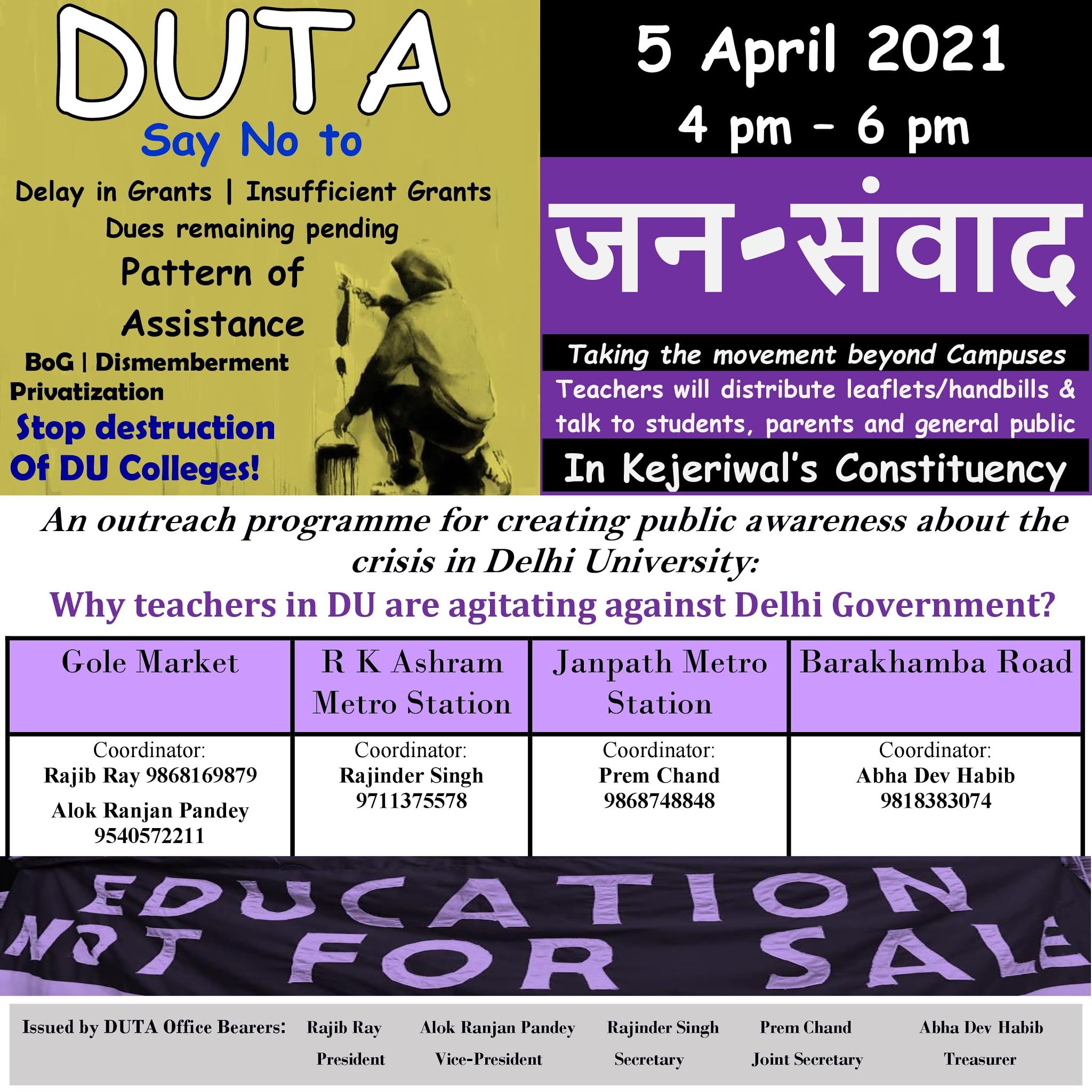 Jan-Samvad, an outreach action programme in the constituency of Sh Arvind Kejriwal and Sh Manish Sisodia, is scheduled for 5 April 2021 and 9 April 2021 respectively. These are part of our ongoing movement to save 12 DU Colleges that are 100% funded by Delhi Government. Please find the poster of the 5 April action programme attached. We request teachers to join at one of the listed protest site as per their convenience. Teachers will distribute leaflets and explain issues to passersbys from 4 pm to 6 pm. We shall maintain Covid 19 safety protocols. Sites have been chosen keeping in mind the possibility of forming human chains at these sites.