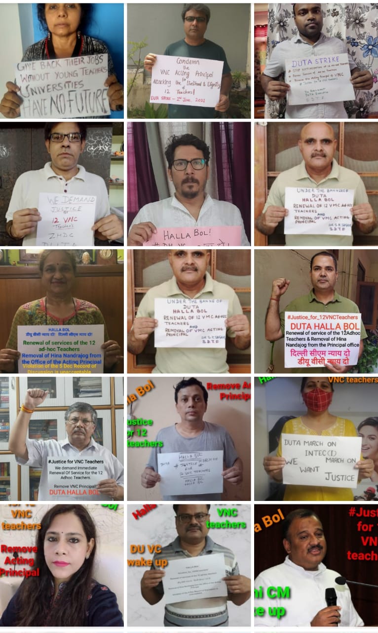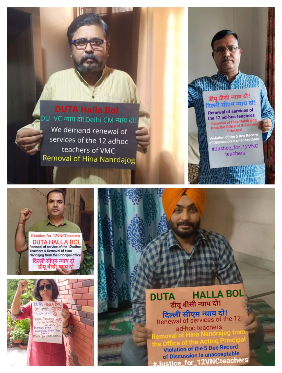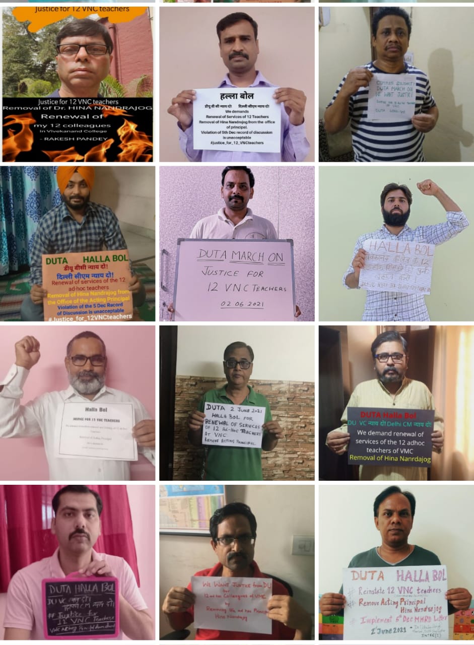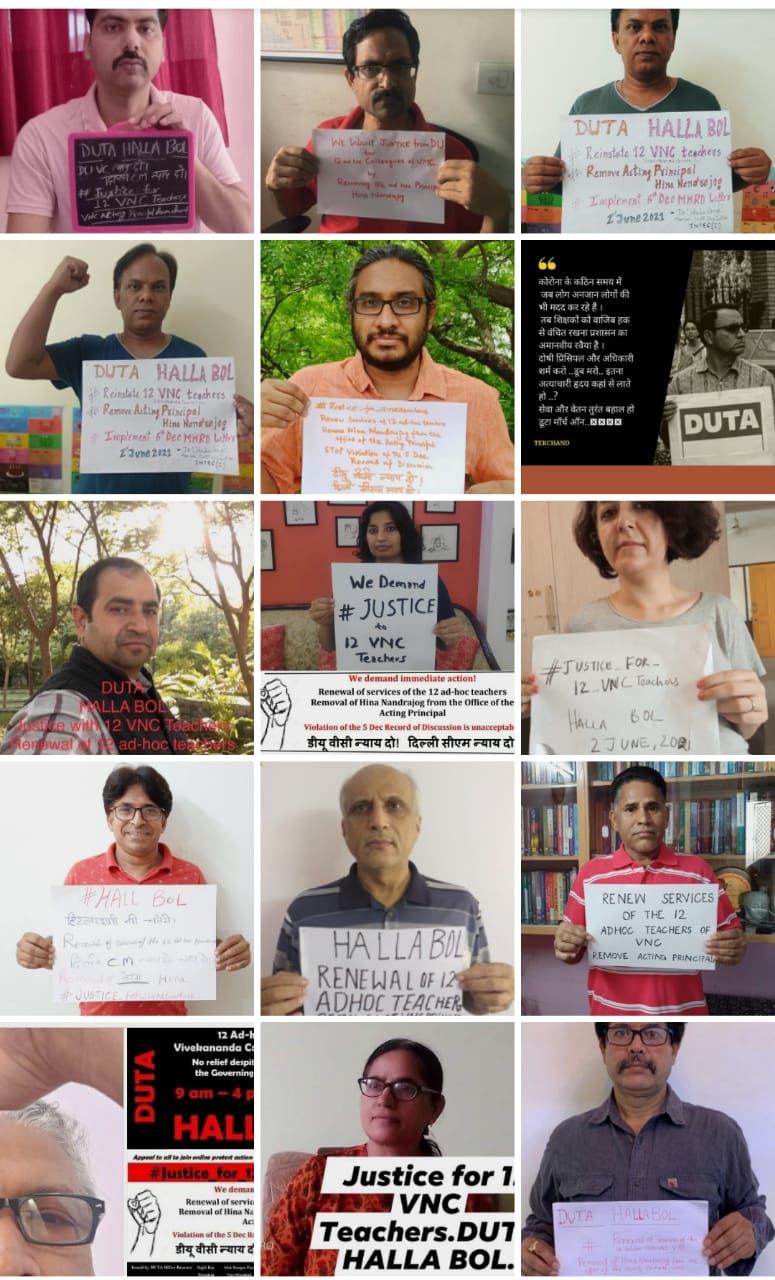 Teachers from across Delhi University today massively participated in DUTA’s online protest action program HALLA BOL demanding immediate renewal of services of the 12 ad hoc teachers of Vivekananda College. Teachers strongly supported DUTA’s demand of immediate removal of Dr. Hina Nandrajog from the office of the Acting Principal of the college. Placards of teachers in today’s online protest clearly condemned the unnecessary delay in renewing services of these teachers, especially at a time when teachers are struggling to cope in the wake of the second wave of the pandemic.