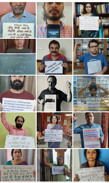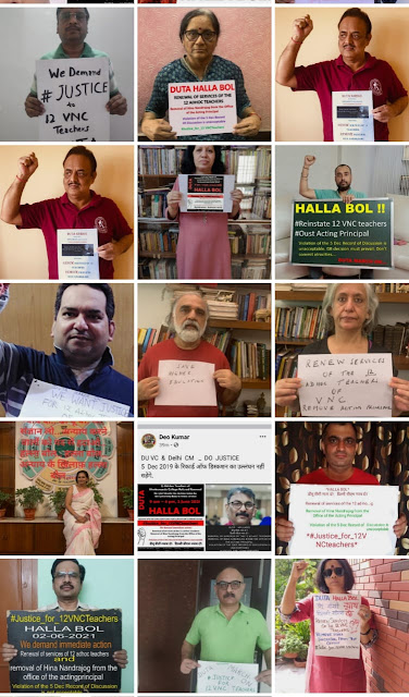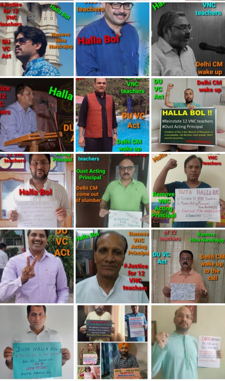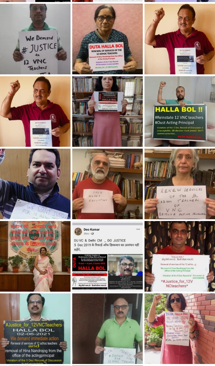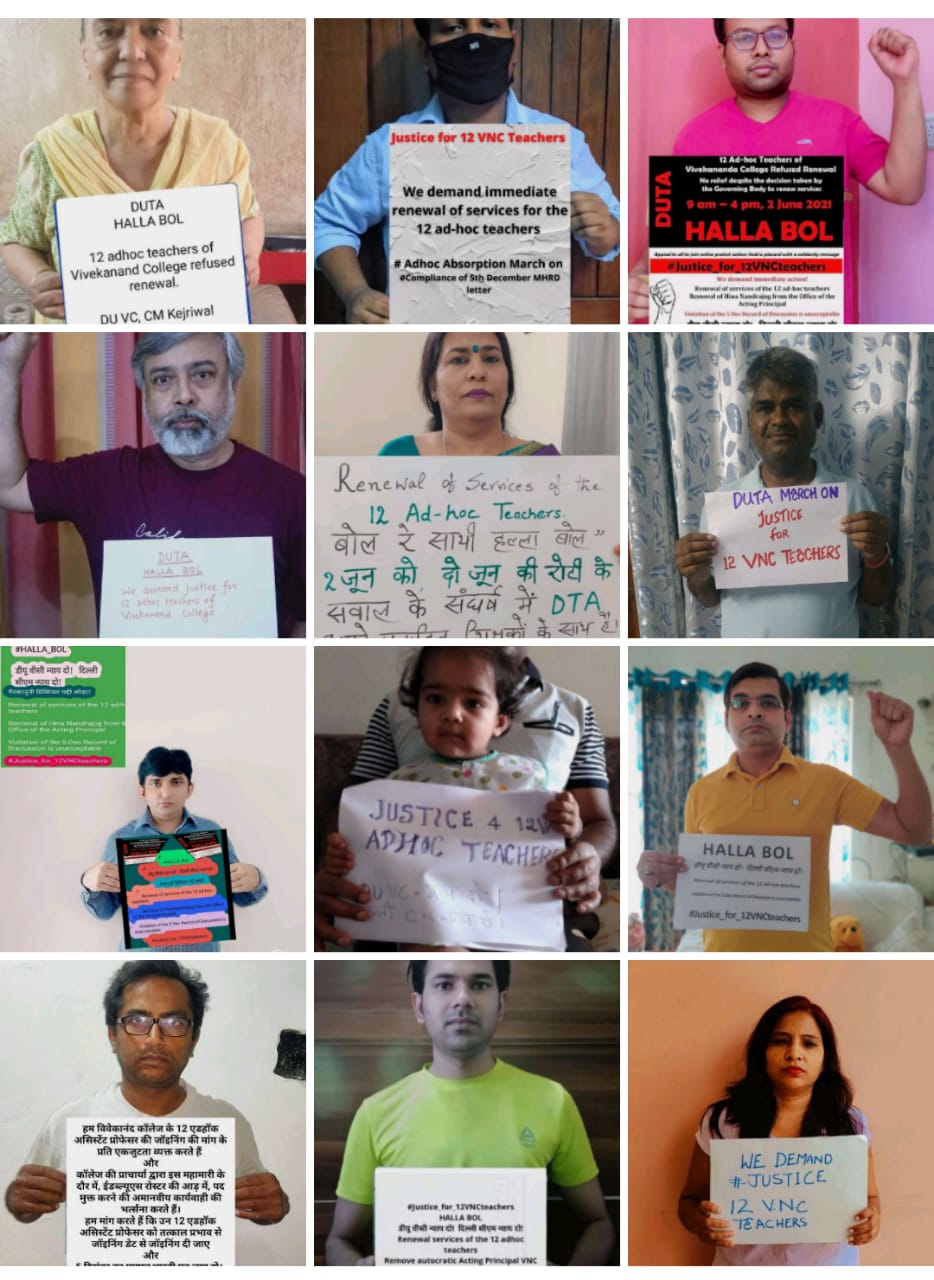 Teachers from across Delhi University today massively participated in DUTA’s online protest action program HALLA BOL demanding immediate renewal of services of the 12 ad hoc teachers of Vivekananda College. Teachers strongly supported DUTA’s demand of immediate removal of Dr. Hina Nandrajog from the office of the Acting Principal of the college. Placards of teachers in today’s online protest clearly condemned the unnecessary delay in renewing services of these teachers, especially at a time when teachers are struggling to cope in the wake of the second wave of the pandemic.