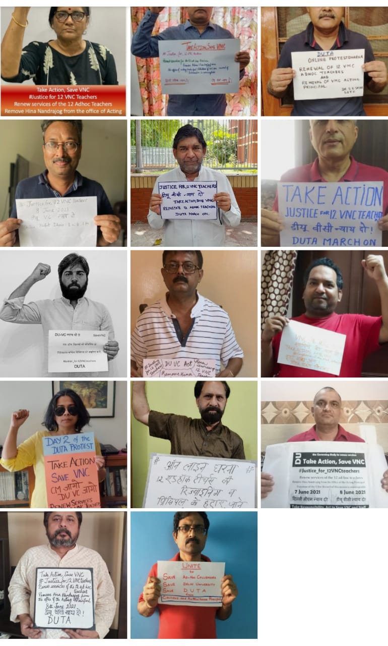 As part of the ongoing movement to demand justice for the 12 adhoc teachers of Vivekananda College whose services were not renewed, the DUTA held a two-day Online Protest Dharna starting from 7.6.2021.